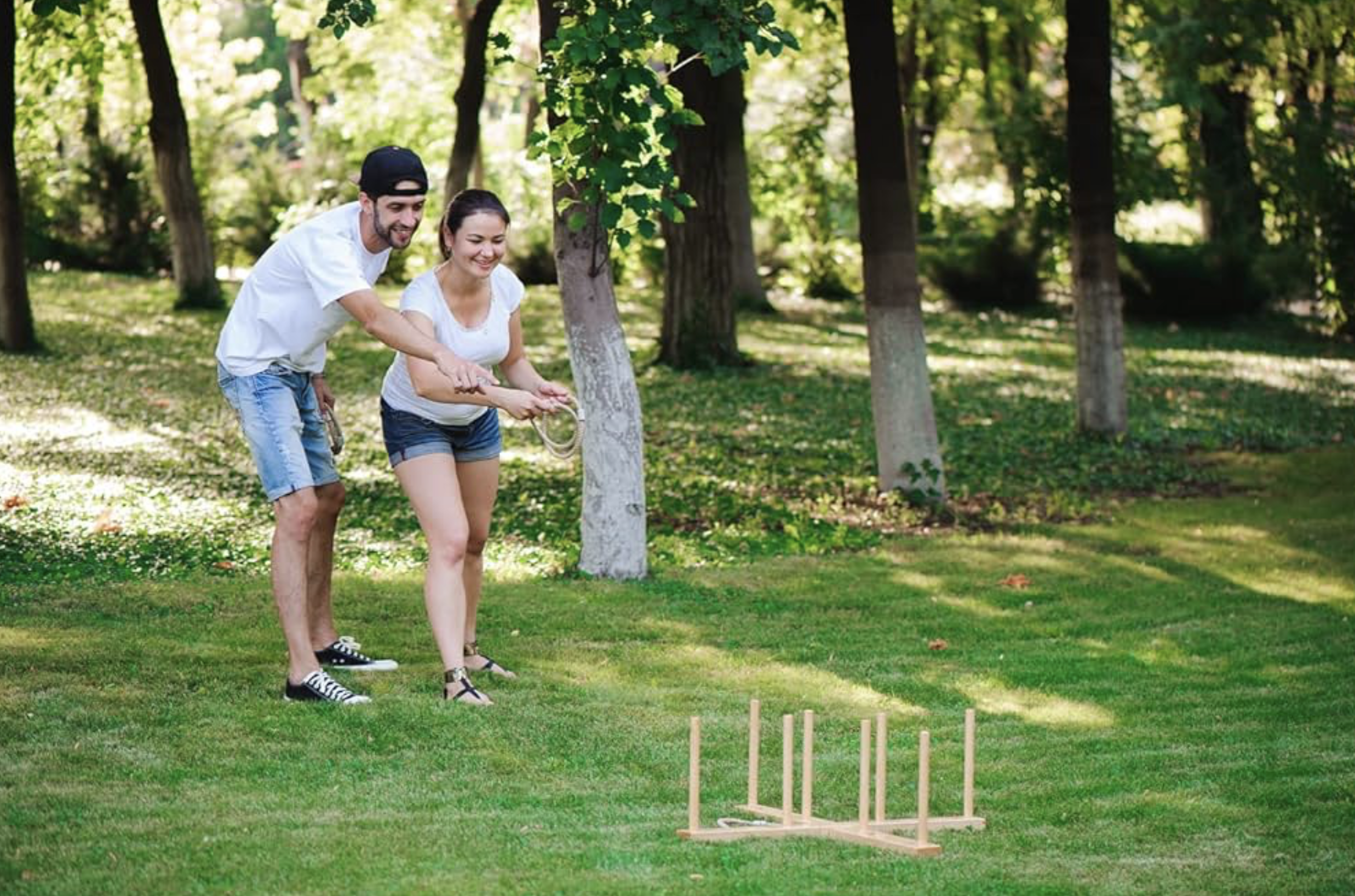 Lancer les 4 anneaux en visant les piquets pour marquer le plus de points possible.