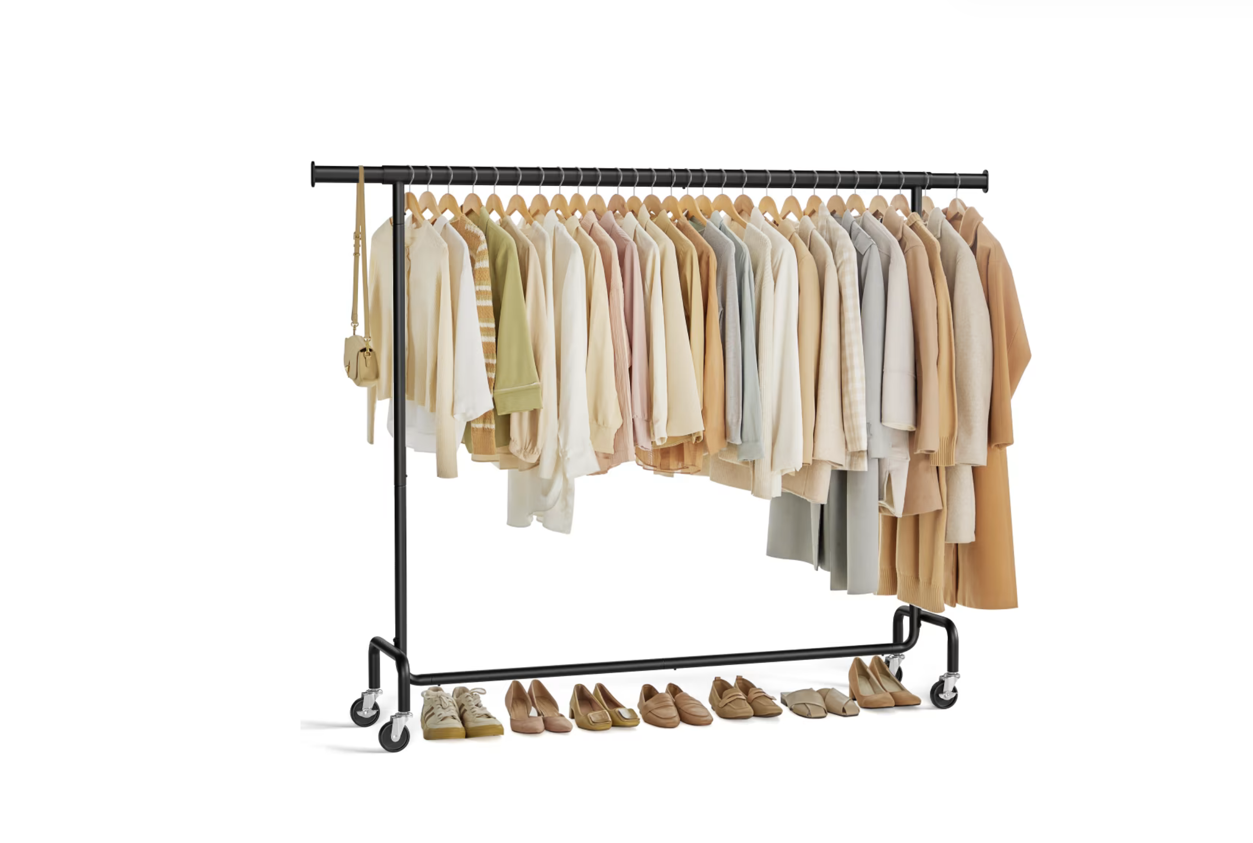 🧥 Location Vestiaire / Portant à vêtements noir sur roulettes – 1,60 m à 2 m – 60 cintres en bois inclus